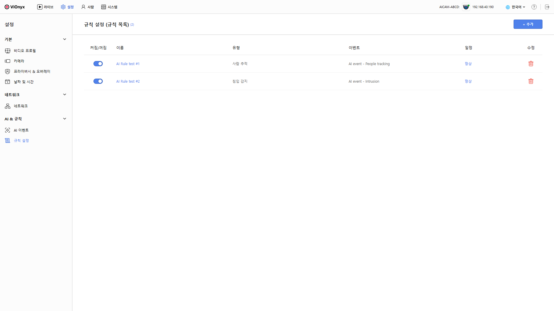 규칙 목록에서 각 규칙 항목 가장 왼쪽의 토글 버튼을 클릭하면, 해당 규칙을 활성화하거나 비활성화할 수 있습니다. 활성화된 규칙은 AI 이벤트가 발생했을 때 설정된 동작이 실행됩니다. 비활성화된 규칙은 AI 이벤트가 발생해도 동작이 실행되지 않습니다.