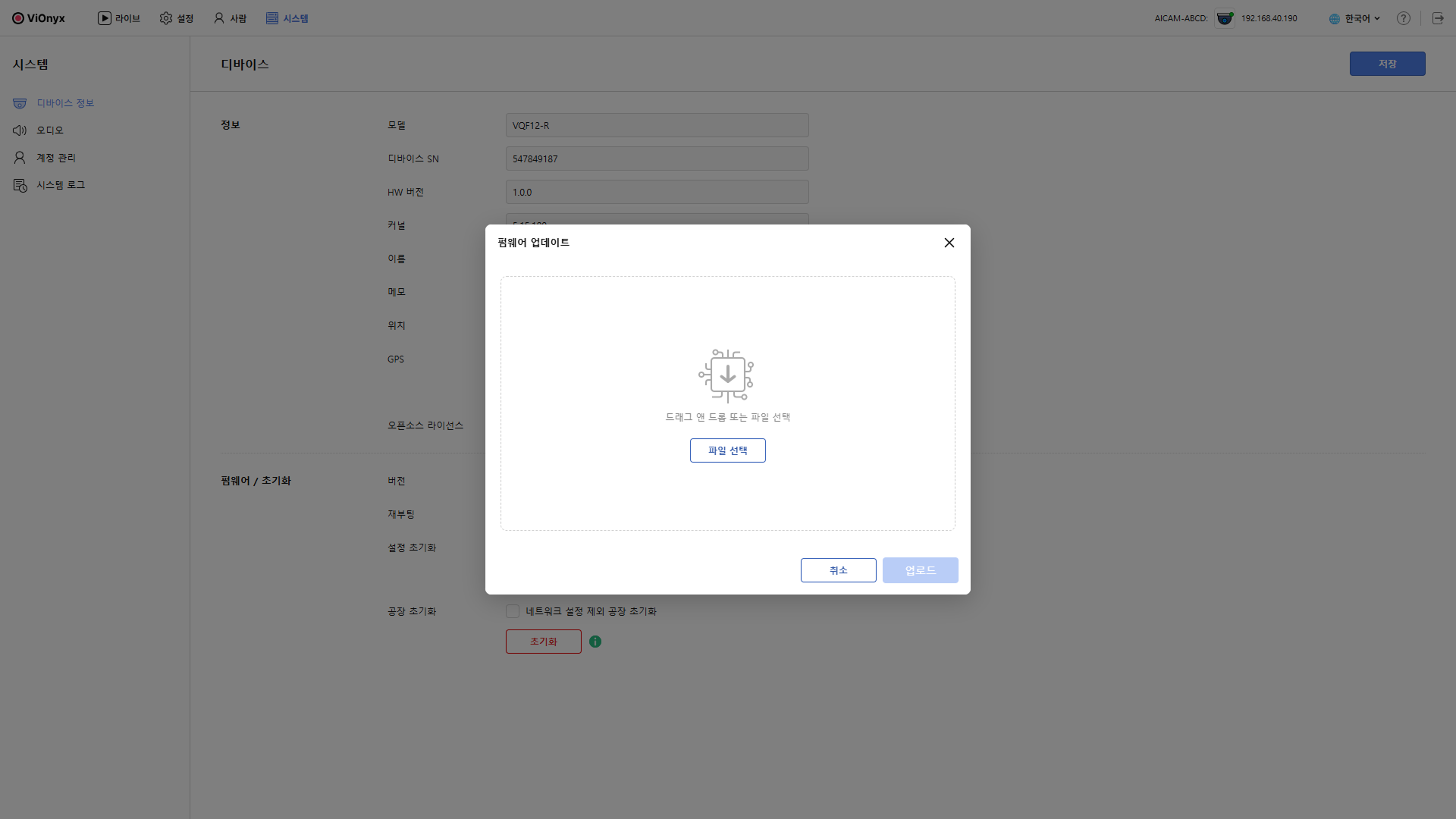 카메라가 재부팅한 후 웹 UI에 다시 접속하세요. 새로운 펌웨어 버전을 확인하려면 디바이스 정보로 이동하세요.