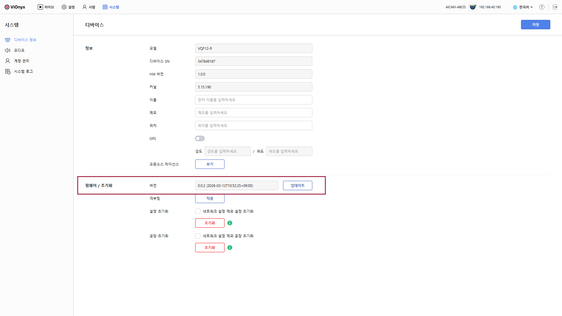 펌웨어 / 초기화 섹션의 버전 에서 현재 설치된 펌웨어 버전을 확인할 수 있습니다.