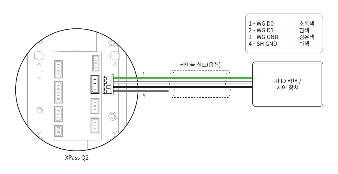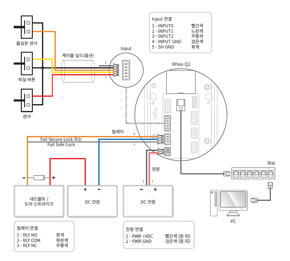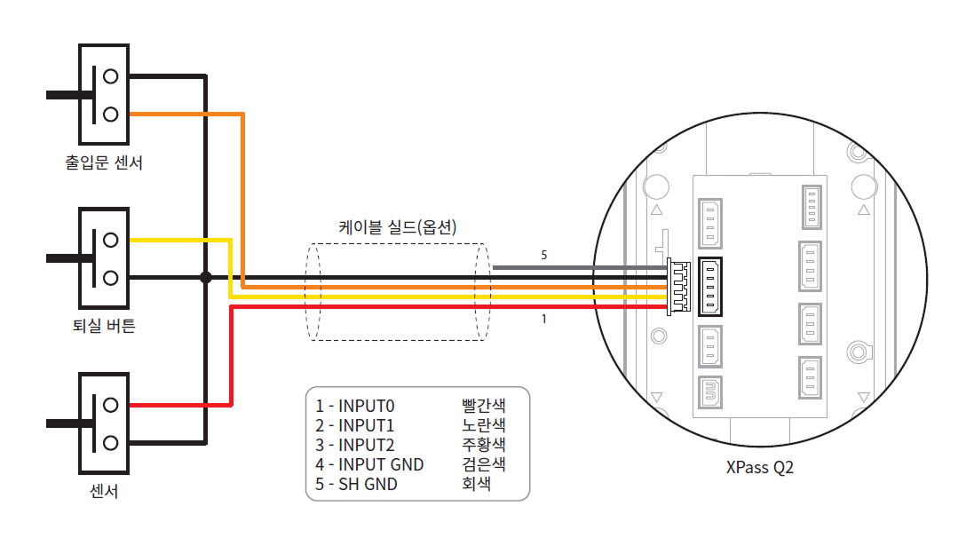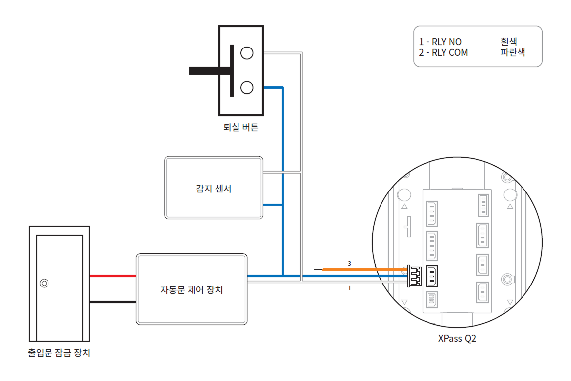 별도의 I/O 장치를 연결하지 않고 제품을 직접 출입문 잠금 장치, 퇴실 버튼, 출입문 센서 등에 연결할 수 있습니다.
