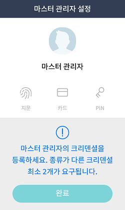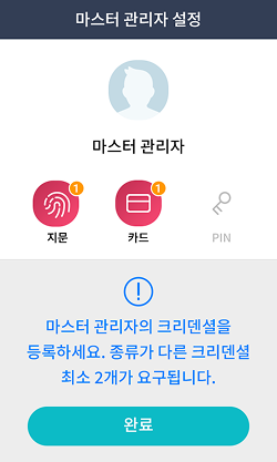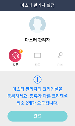 두 종류 이상의 크리덴셜을 등록한 후, 완료 버튼을 누르면 마스터 관리자 등록이 완료됩니다.