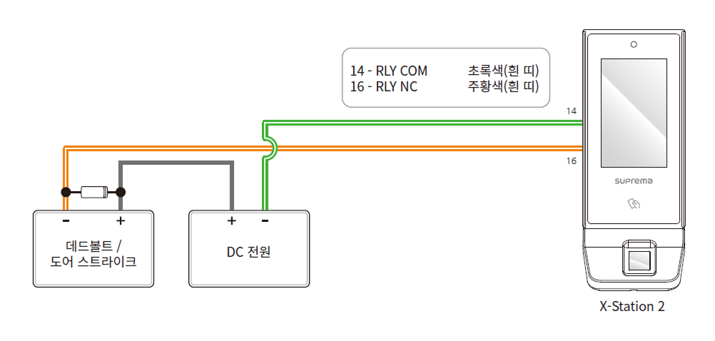 슈프리마의 지능형 장치에는 편의를 제공하기 위해 별도의 컨트롤러 없이 독립형으로 연결하여 출입문을 직접 열거나 잠글 수 있도록 하는 릴레이가 내장되어 있습니다. 그러나 향상된 보안이 요구되는 출입통제 애플리케이션의 경우 잠재적으로 출입문 잠금 해제를 유발할 수 있는 변조 공격을 방지하기 위해 장치에 내장된 릴레이를 사용하지 않는 것이 좋습니다. 이러한 애플리케이션의 경우 잠금 제어를 위해 출입문 내부의 안전한 위치에 설치된 슈프리마의 Secure I/O 2, DM-20, CoreStation과 같은 별도의 릴레이 장치를 사용할 것을 권장합니다.