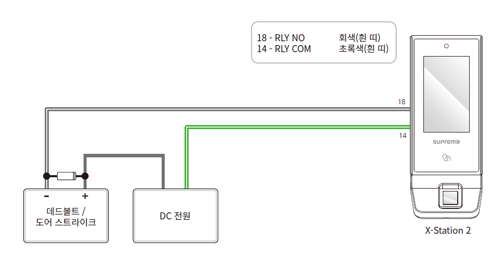 Fail Secure Lock을 사용하려면 아래 그림과 같이 N/O 릴레이를 연결하세요. Fail Secure Lock은 평상 시 릴레이 회로에 전류가 흐르지 않으며, 릴레이가 동작하여 전류가 흐르면 출입문이 열립니다. 정전이 되거나 외부 요인으로 장치의 전원이 끊길 경우 출입문이 잠깁니다.