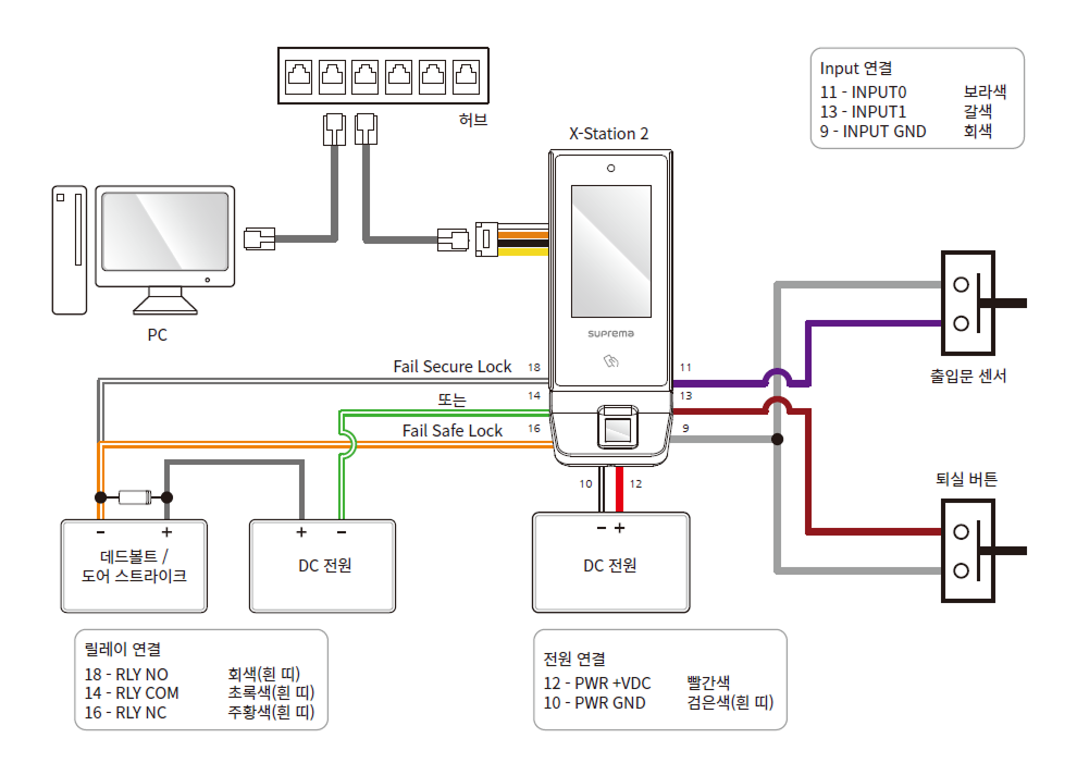 별도의 I/O 장치를 연결하지 않고 제품을 직접 출입문 잠금 장치, 퇴실 버튼, 출입문 센서 등에 연결할 수 있습니다.