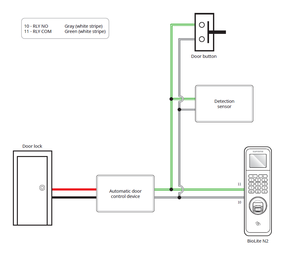 In order to use the Fail Secure Lock, connect N/O relay as shown in the figure below. There is normally no current flowing through the relay for the Fail Secure Lock. When the current flow is activated by the relay, the door will open. If the power supply to the product is cut off due to a power failure or an external factor, the door will lock.