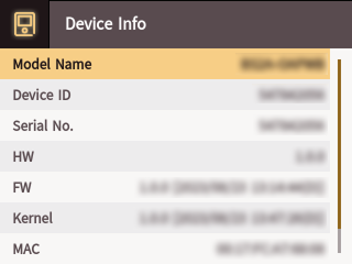 Select DEVICE → More Settings → Device Info and then press OK. You can view the information for Model Name, Device ID, Serial No., HW, FW, Kernel, MAC, and WiFi MAC.