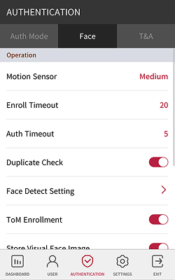 Operation Mode: 얼굴 인증 시 장치의 작동 모드를 설정할 수 있습니다.