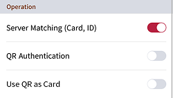 Use QR as Card: 사용자에게 발급한 CSN 카드 또는 Wiegand 카드와 동일한 데이터의 QR코드로 인증할 수 있도록 설정할 수 있습니다. QR Authentication이 활성화되어있는 경우에만 설정할 수 있습니다.