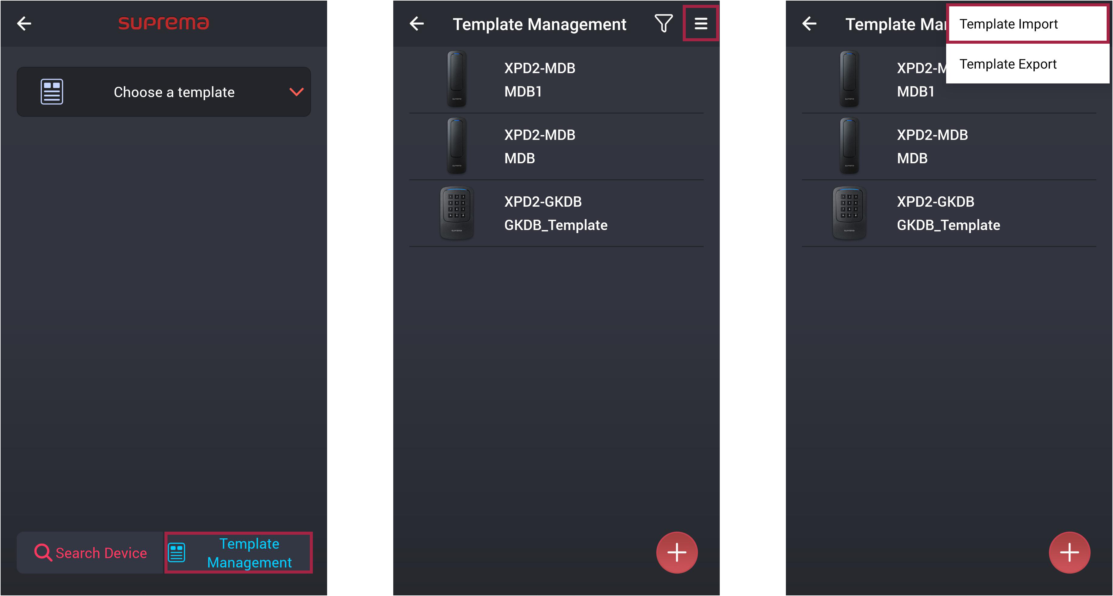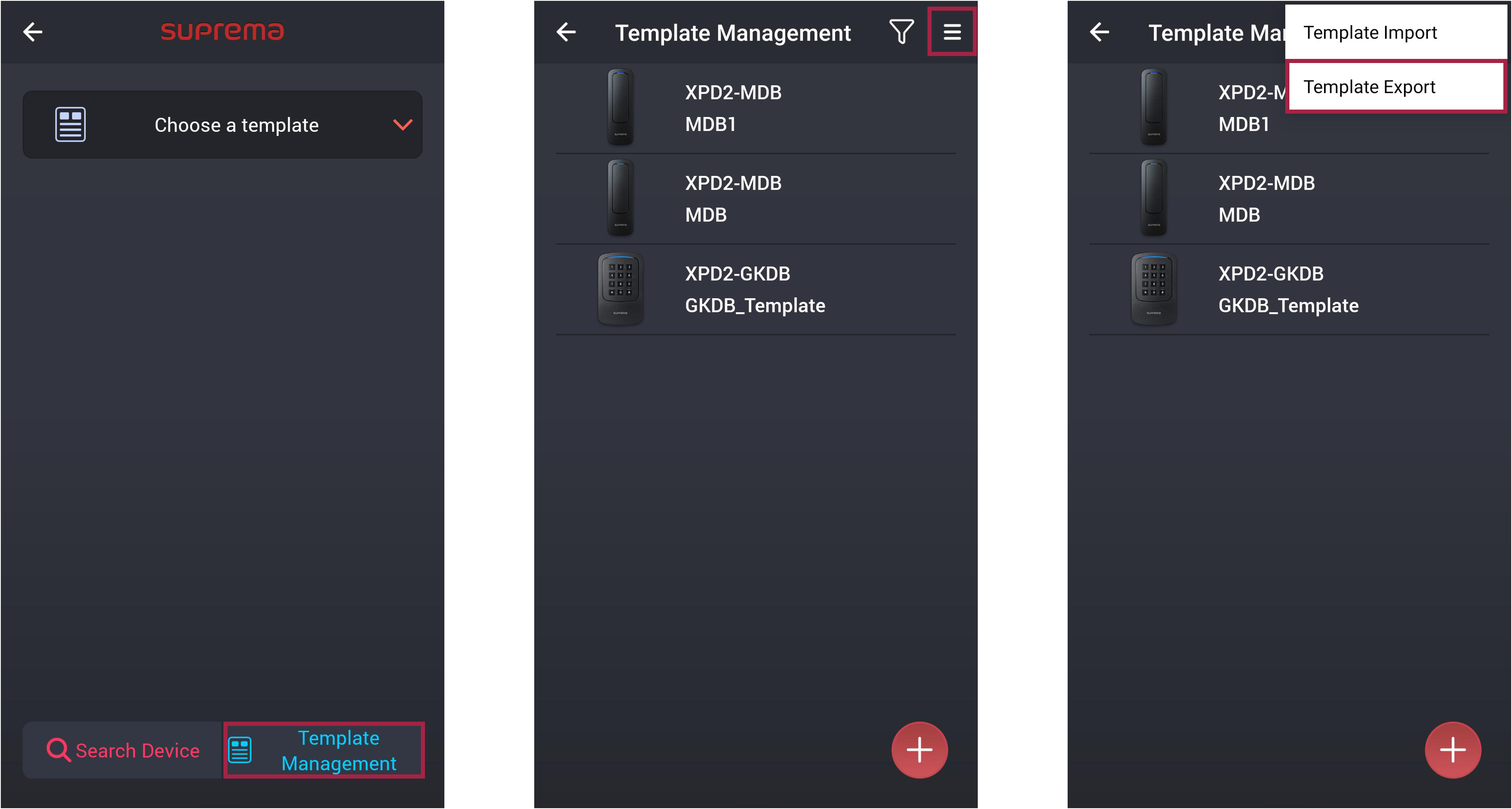 You can configure settings to apply to XPass D2 as a template and then directly apply them to individual devices. You can apply settings much faster than by accessing the management program on a PC or using command cards.