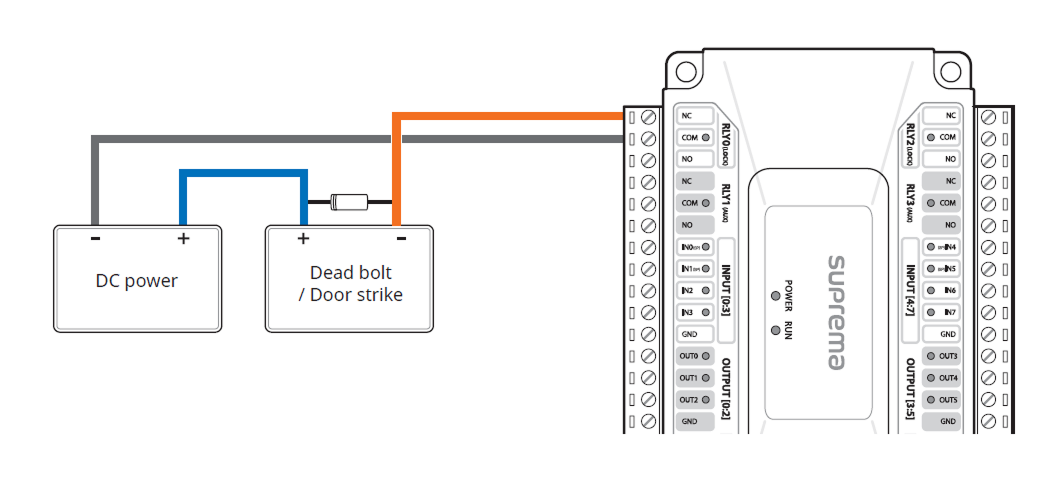 In order to use the Fail Secure Lock, connect NO relay as shown in the figure below. There is normally no current flowing through the relay for the Fail Secure Lock. When the current flow is activated by the relay, the door will open. If the power supply to the product is cut off due to a power failure or an external factor, the door will lock.
