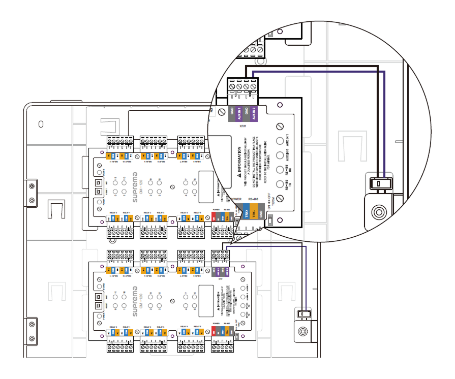 You can connect the contact output (dry contact output) of another device or tamper to the AUX port.