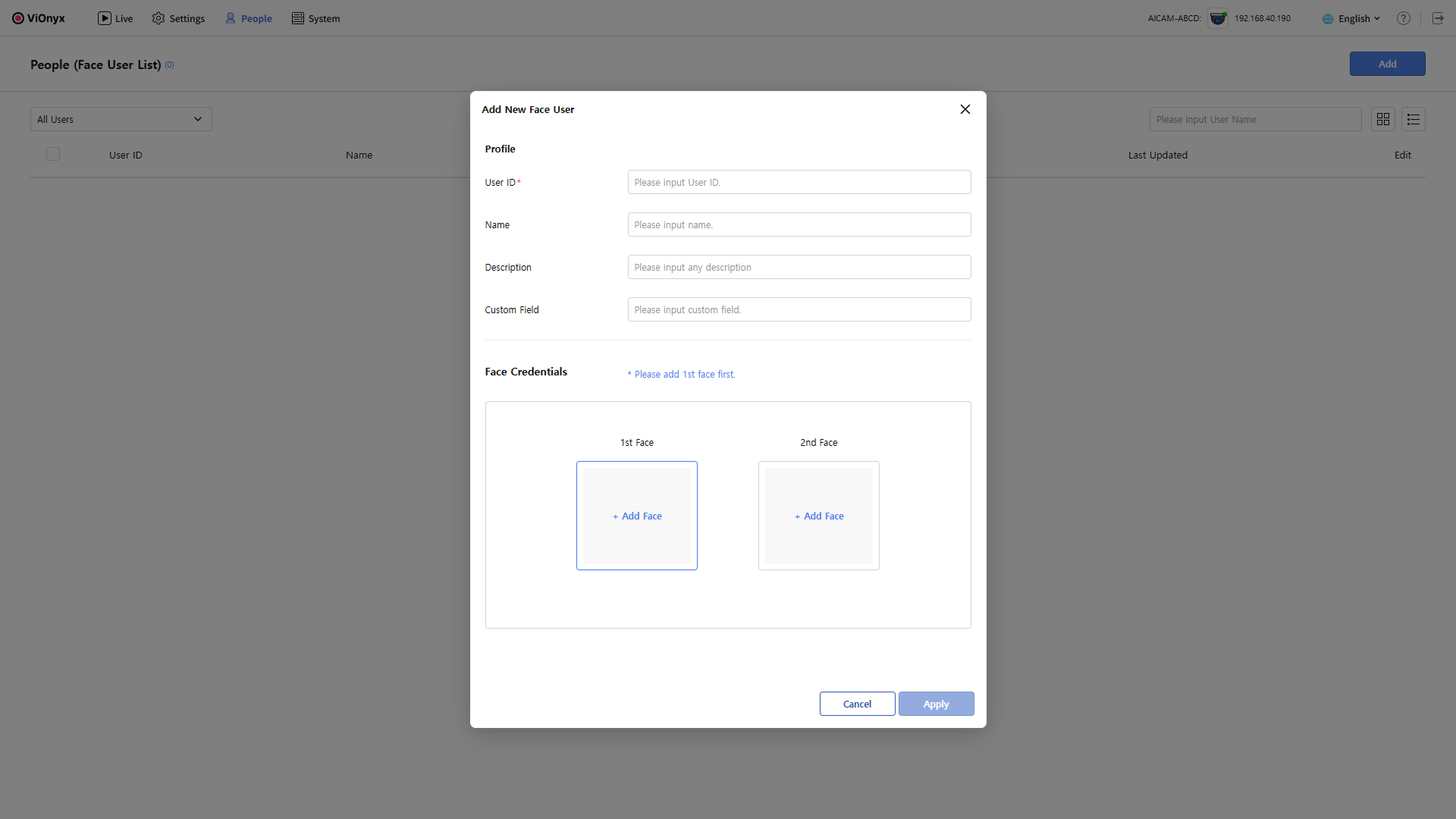 Add New Face User 팝업창이 나타나면 사용자 기본 정보를 입력하세요.