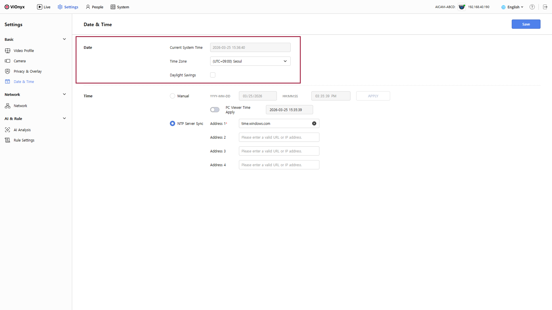 날짜와 시간 설정을 통해 카메라의 시간을 정확하게 유지할 수 있습니다. 시간대를 선택하고 수동으로 시간을 설정하거나 NTP 서버를 통해 자동으로 시간을 동기화할 수 있습니다. 정확한 시간은 영상 타임스탬프 및 AI 이벤트 기록의 신뢰성을 보장합니다.