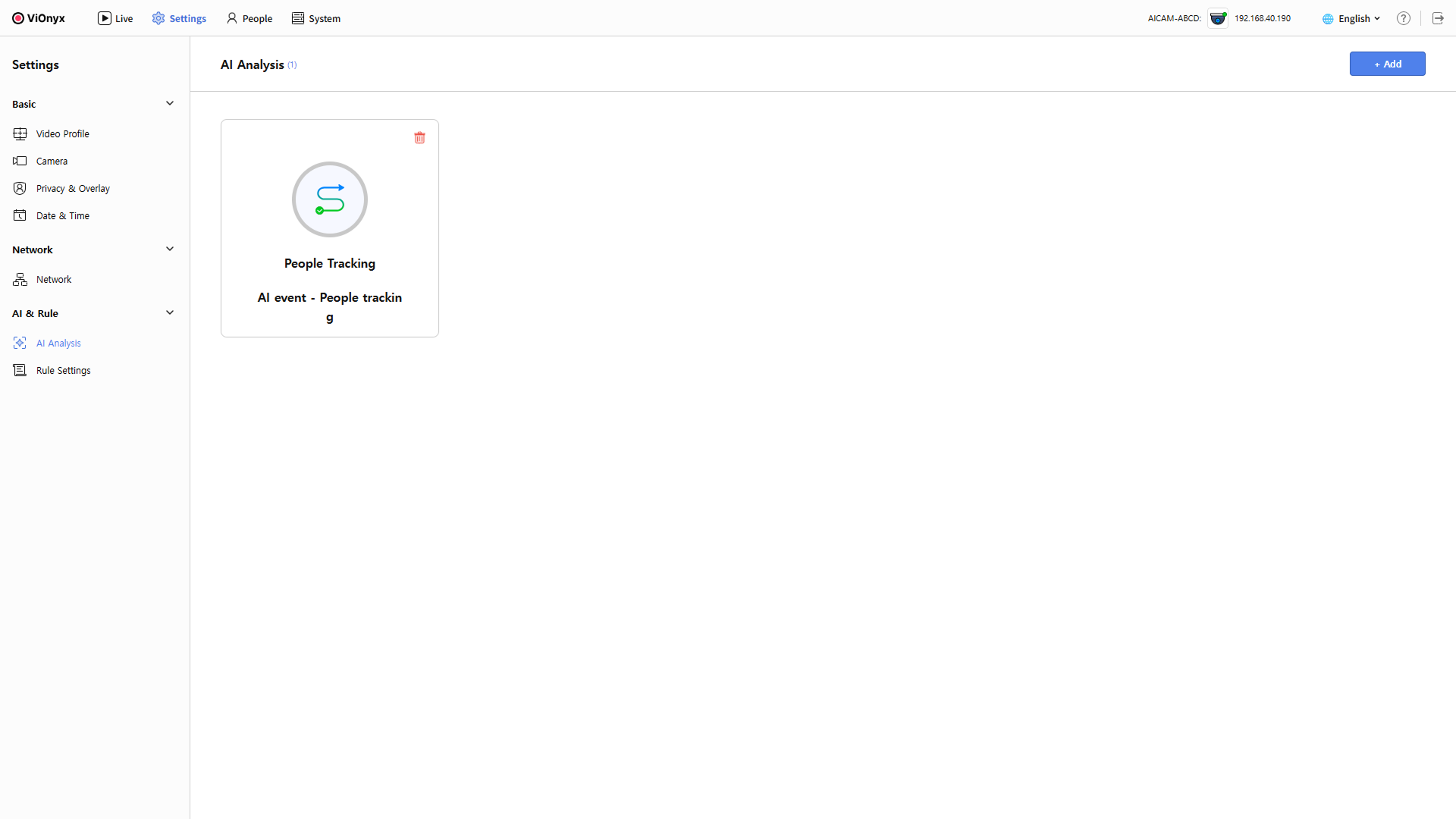 얼굴을 감지할 영역을 설정하세요. 설정하면 해당 영역에서 얼굴을 우선 추적합니다. 얼굴 영역은 진입 영역을 포함하도록 설정하세요. 얼굴 영역이 진입 영역을 포함하지 않으면 카메라가 얼굴을 인식하지 못합니다. + Add 버튼을 클릭해 최대 10개까지 설정할 수 있습니다. 라이브 뷰에 파란색 상자가 표시되며, 마우스로 모서리 또는 점을 드래그하여 원하는 형태로 조정할 수 있습니다. 가운데 영역을 드래그하여 위치를 이동할 수도 있습니다.