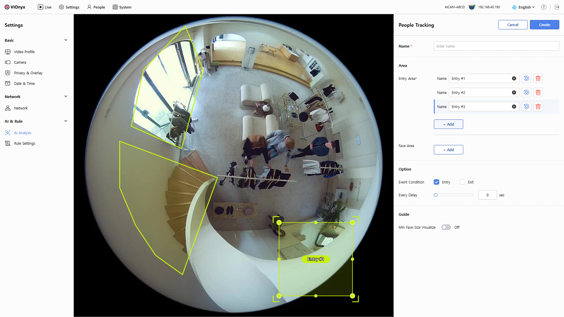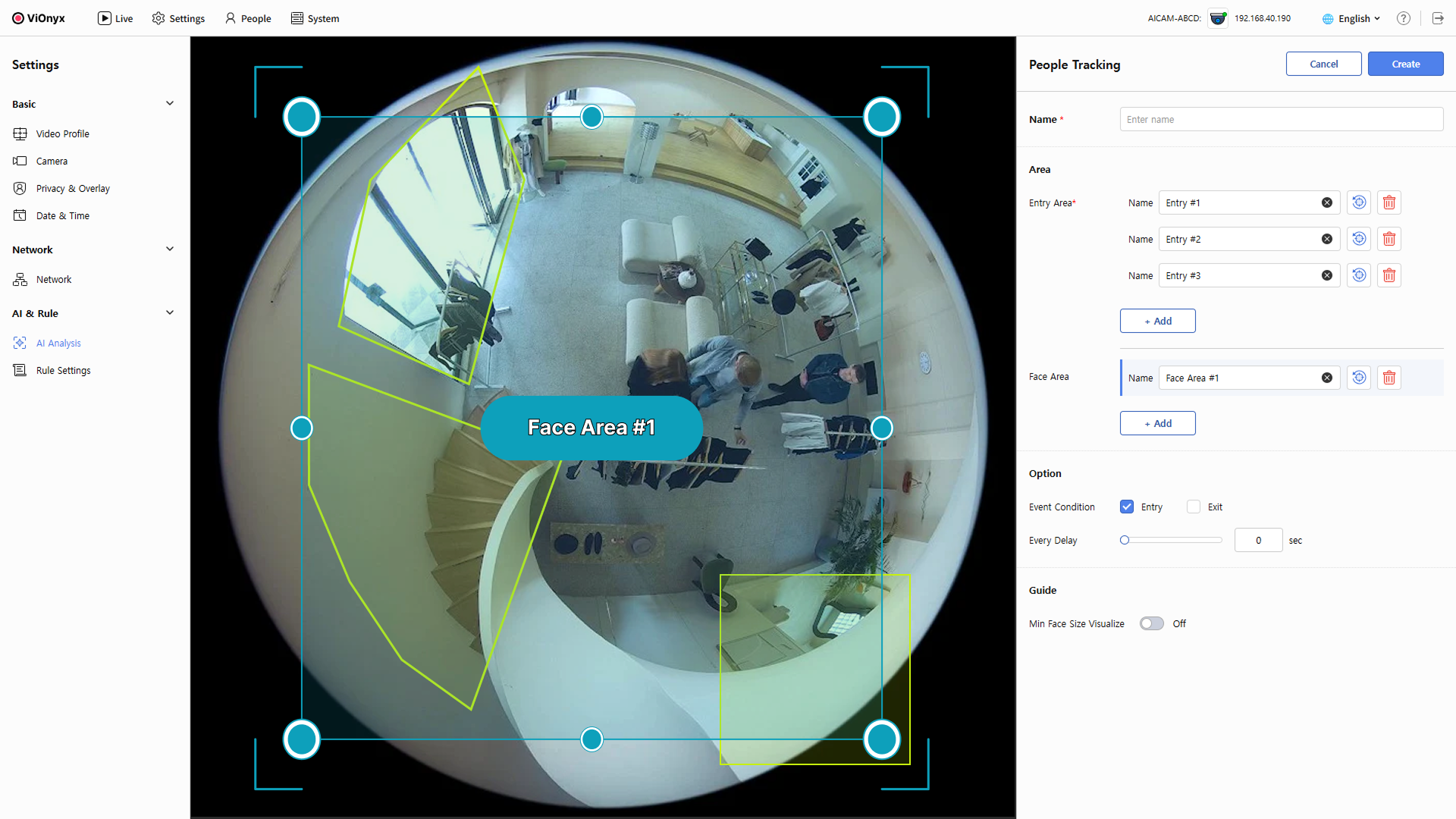 사람 추적 이벤트를 생성하여 진입 구역의 출입을 감지합니다. 선택적으로 얼굴 영역을 추가하면 특정 영역에서 얼굴을 우선적으로 추적할 수 있으며, 등록된 사용자는 신원을 자동 인식합니다.