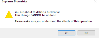 From there if you desire to delete a fingerprint from the User’s profile in the Suprema Devices, please click the Delete button, a warning message will be displayed, click on Yes if you want to delete the credential from the User profile in the Suprema Devices, click No otherwise.