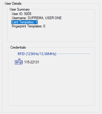 After the card has been registered, you can see or delete the credential by double clicking the Card Templates under User Summary: