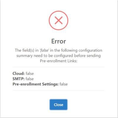 This feature also validates that all needed pre-requisite settings have been already configured, if not it will show you a feedback window for you to know what you still need to configure prior sending the Pre-enrollment links, for example: