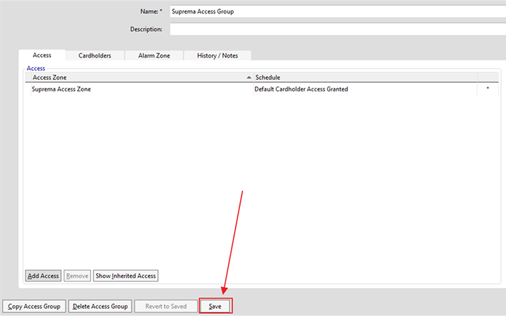 After clicking New Access Group button, a pop-up will be opened as shown below image set the Name as Suprema Access Group and click on the Close button then a pop-up will be closed.