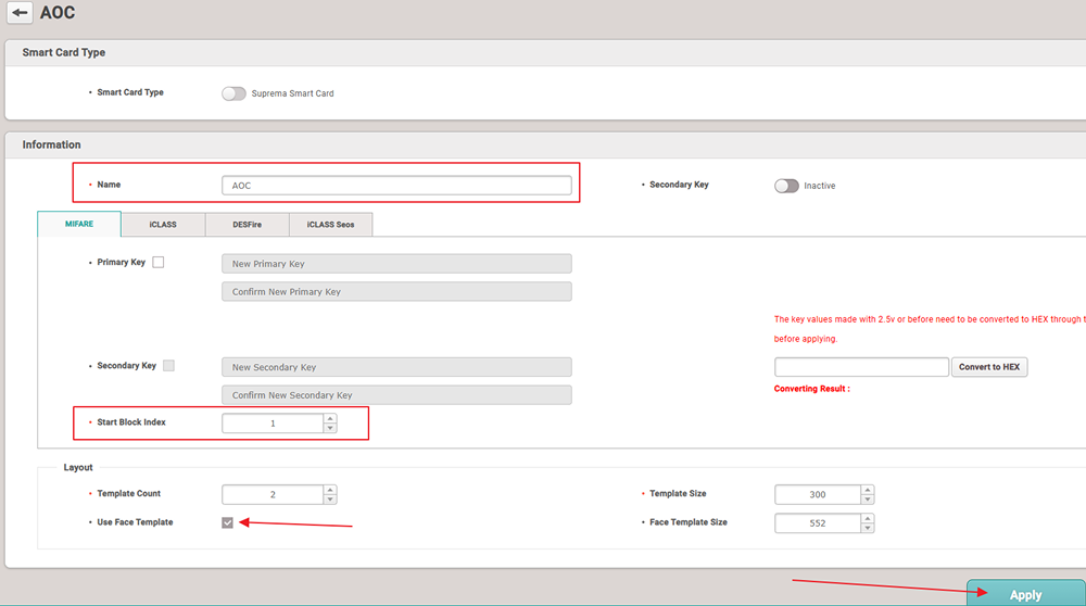 Now enter the name as AOC Inside MIFARE type enter 1 for Start Block Index, tick the checkbox for Use Face template, and press the Apply button.