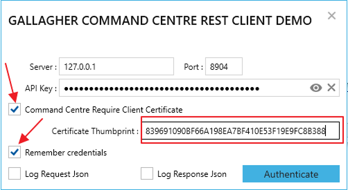 Tick the Command Centre Requirement Client Certificate and fill in the Certificate Thumbprint, also tick the Remember credentials (Optional).