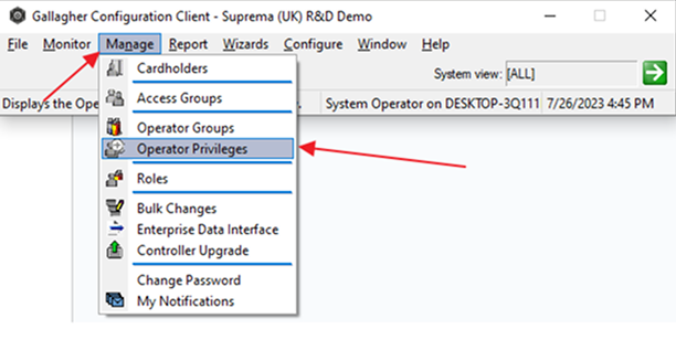 Now select the Operator Privileges setting on Operator group and go to the Gallagher configuration client window Manage → Operator Privileges. Now drag and drop.