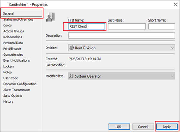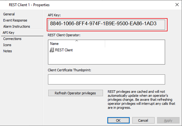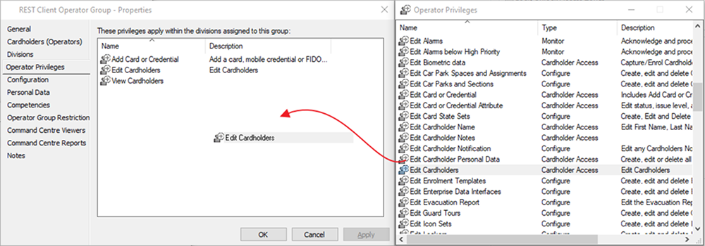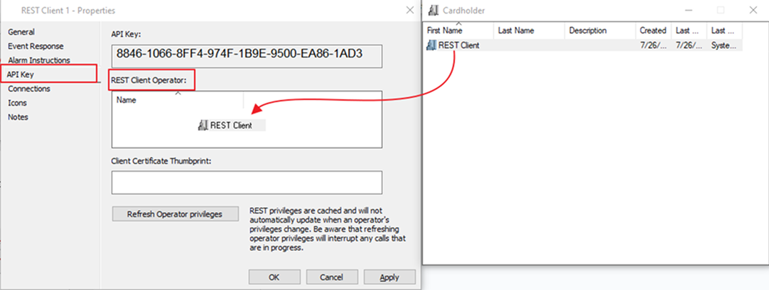 In the API key section Drag and Drop the REST Client from Cardholder to REST Client Operator. Click Apply. Close the Cardholder window.