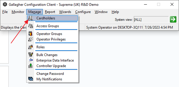 Open the Gallagher Configuration Client window and go to Configure → Hardware.
