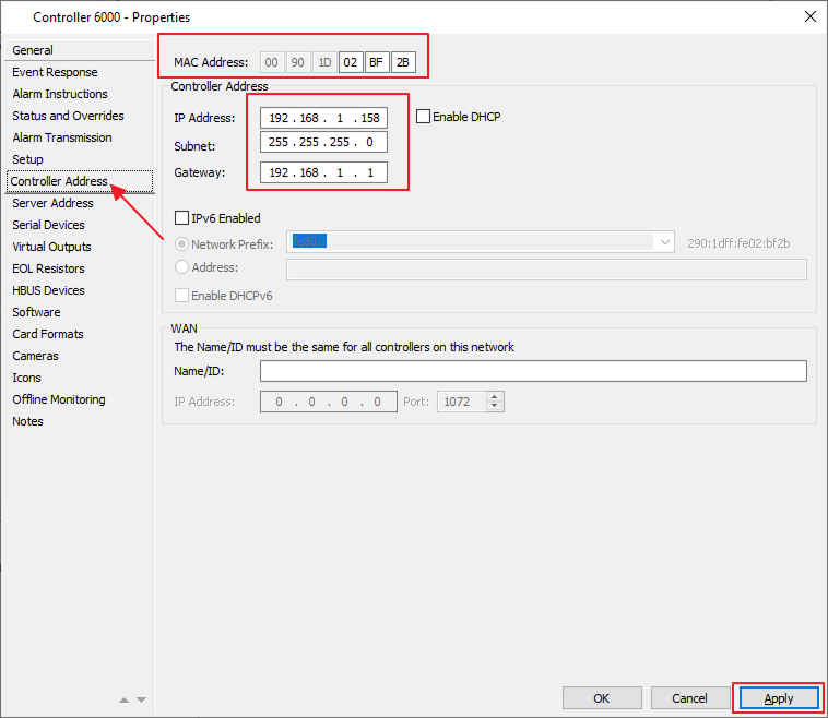 In the Controller Address setting set your controller MAC address (Please look at your C6000 controller), Also set the IP address assigned for the Controller, Subnet, and Gateway. Press the Apply button.