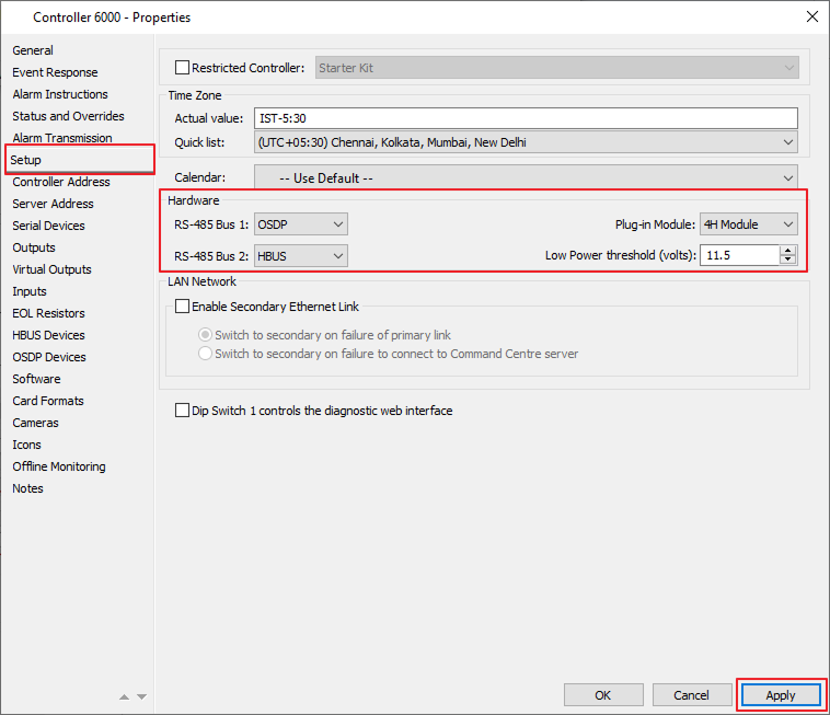 In the Setup Tab, set Plug in Module as 4H Module (choose according to your controller) and in Hardware RS485 Bus 1 as OSDP and RS485 Bus 2 as HBUS and press Apply.