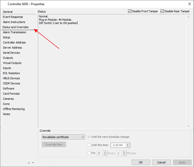 In the Status and Overrides options tick both checkboxes Disable Front Tamper and DisableRear Tamper.