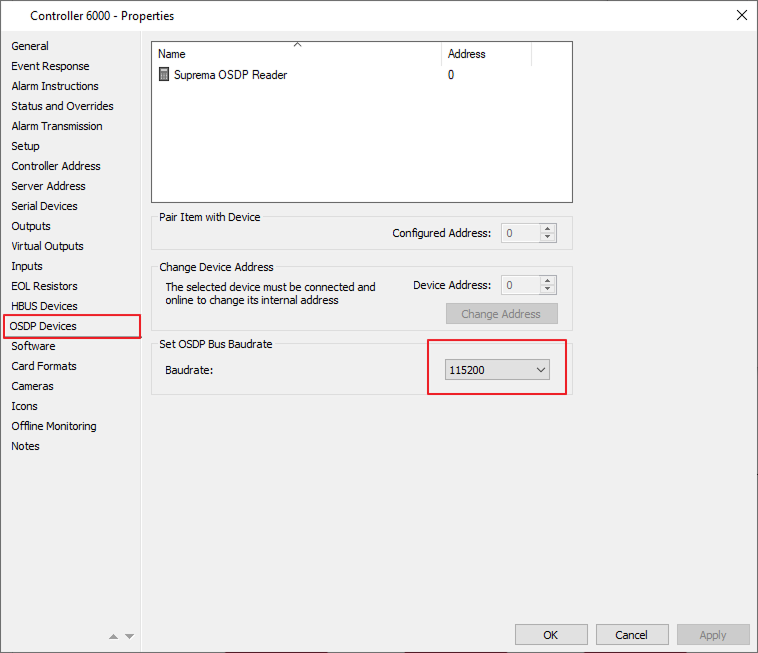 Drag the OSDP reader from the Hardware Window to the Controller properties in the OSDP Devices Tab. Set Configured Address as 0, Suprema OSDP Device Address as 0, and Baudrate as 115200.