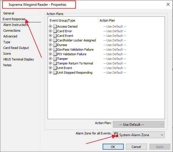 A new window opens up. Set its name as Suprema OSDP Reader, and in the Event Response settings, tab set Alarm Zone for all events: as System Alarm Zone. Then click Apply & press OK to save the changes.