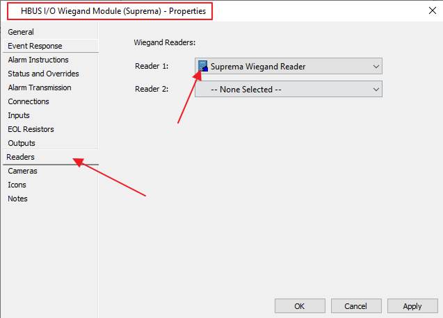 In HBUS I/O properties go to Reader settings and set Reader 1 as Suprema Wiegand Reader, press the OK button. Close the door and Controller window.