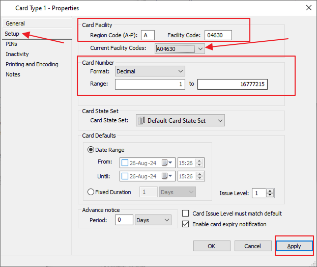 In Card type properties go to setup option Region code as A and Facility code as 10000 card number range as 4194304 to 8388607 and enable card expiry notification. Press OK.