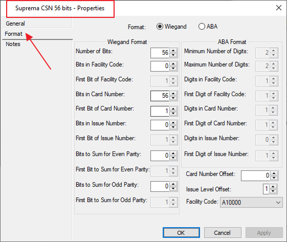 Create a third card format as Suprema CSN 56 bits, and in the format set as shown below.