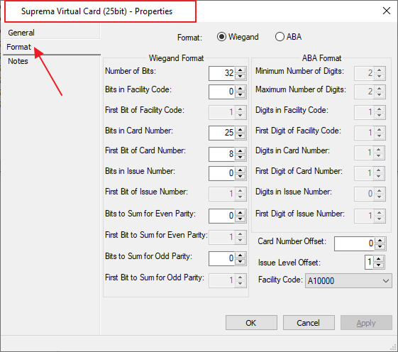 Create a fourth card format as Suprema Virtual Card (25bit), and in the format set as shown below.