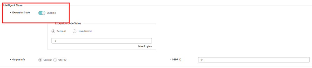 In intelligent slave expectation code as Enabled, output info as Card ID OSDP ID as 0.