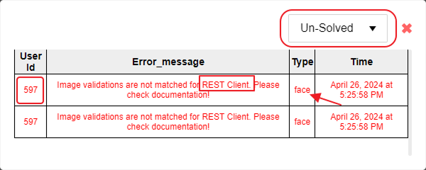 As in the below Image, we have an error for one user, Here the Type defines what type of error it is, Status Un-solved means the Error is not solved for the user yet and Solved indicates the error is solved for the user. Now the one red box indicates the name of the user and the another red box indicates the user ID.