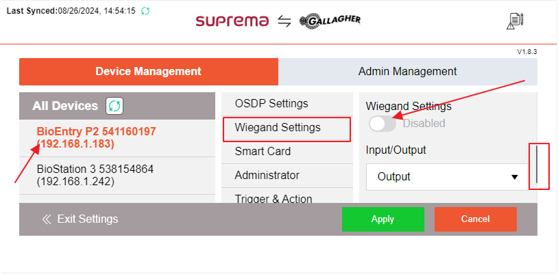 If you want to use the HID ICLASS card option go to settings in the device, press the settings button, and inside Device Management select the device you want to configure and select the Wiegand Settings option then scroll down and find the Wiegand settings.