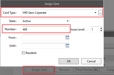 To use the feature, you have to assign the card to the user. Go to the Gallagher command center, press the assign card button, select the HID Seos Corporate, enter the number, press the OK button, and press Save.