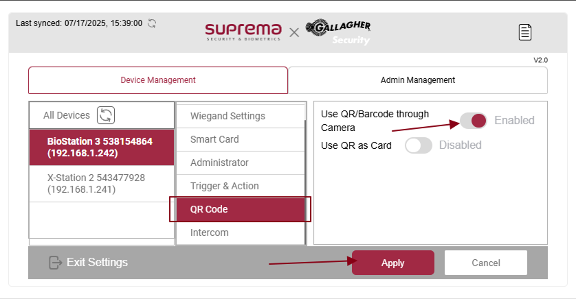 If you want to use the QR Code card option, go to settings by pressing the settings button, and inside Device Management, select the device you want to configure. Then, select the QR Code Settings option, and enable the use of QR/Barcode through the camera option settings. Press the Apply button to save the changes.