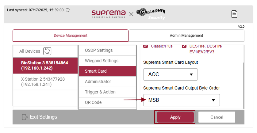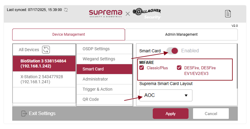 If you want to use the Smart Card (AOC/TOC) option go to settings in the device, press the settings button, and inside Device Management select the device you want to configure and select the Smart Card option.