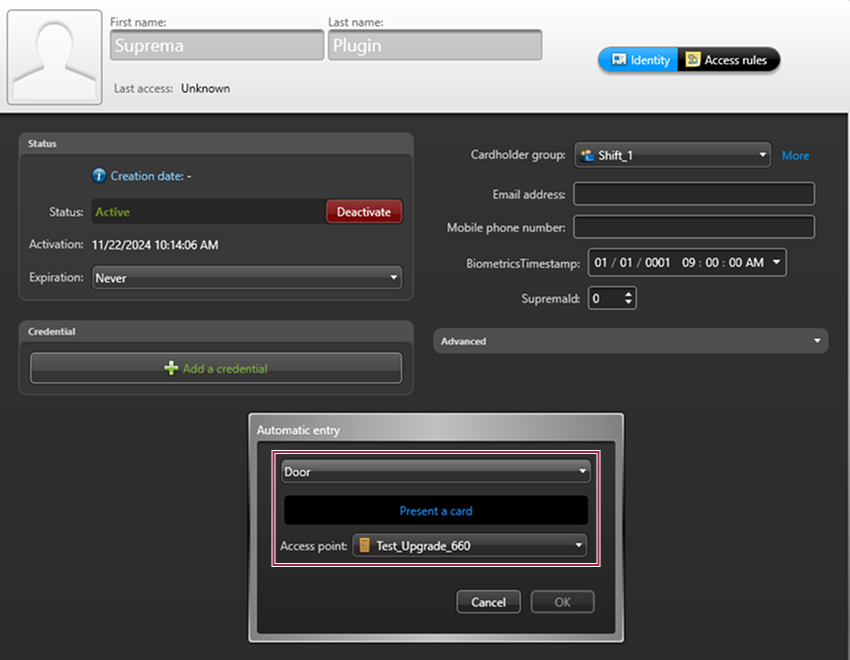 Select the Door assigned to the Suprema device as a reader, then tag a card to the device.