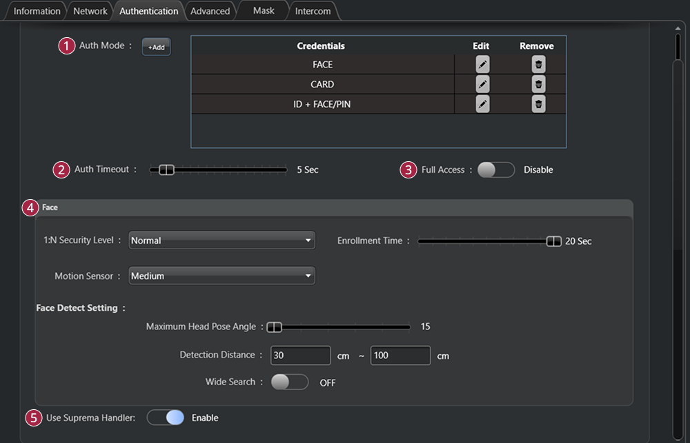 | Auth Timeout | When using a combination of multiple credentials in Auth Mode, the system waits for this length of time to authenticate the second credential. Set a timeout period for authenticating the second credential after authenticating the first credential. If the second credential is not authenticated within this time, the authentication fails. | |