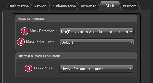 | Mask Detection | You can set whether to use mask detection or not. If you select Use (Deny access when failed to detect mask), it refuses authentication of users who are not wearing a mask and saves event logs. If you select Use (Allow access after leaving log when failed to detect mask) users who are not wearing a mask can authenticate but event logs still be saved. | |