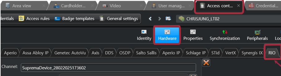 When the RIO protocol is enabled, the RIO tab becomes available on the Hardware page under Config Tool → Access Control → Cloud Link.