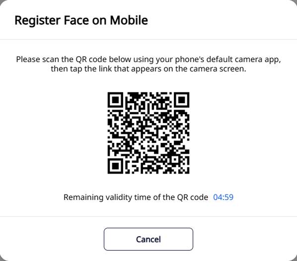 Register on Mobile: Scan a QR code with a mobile device’s camera to open a link for face image enrollment.