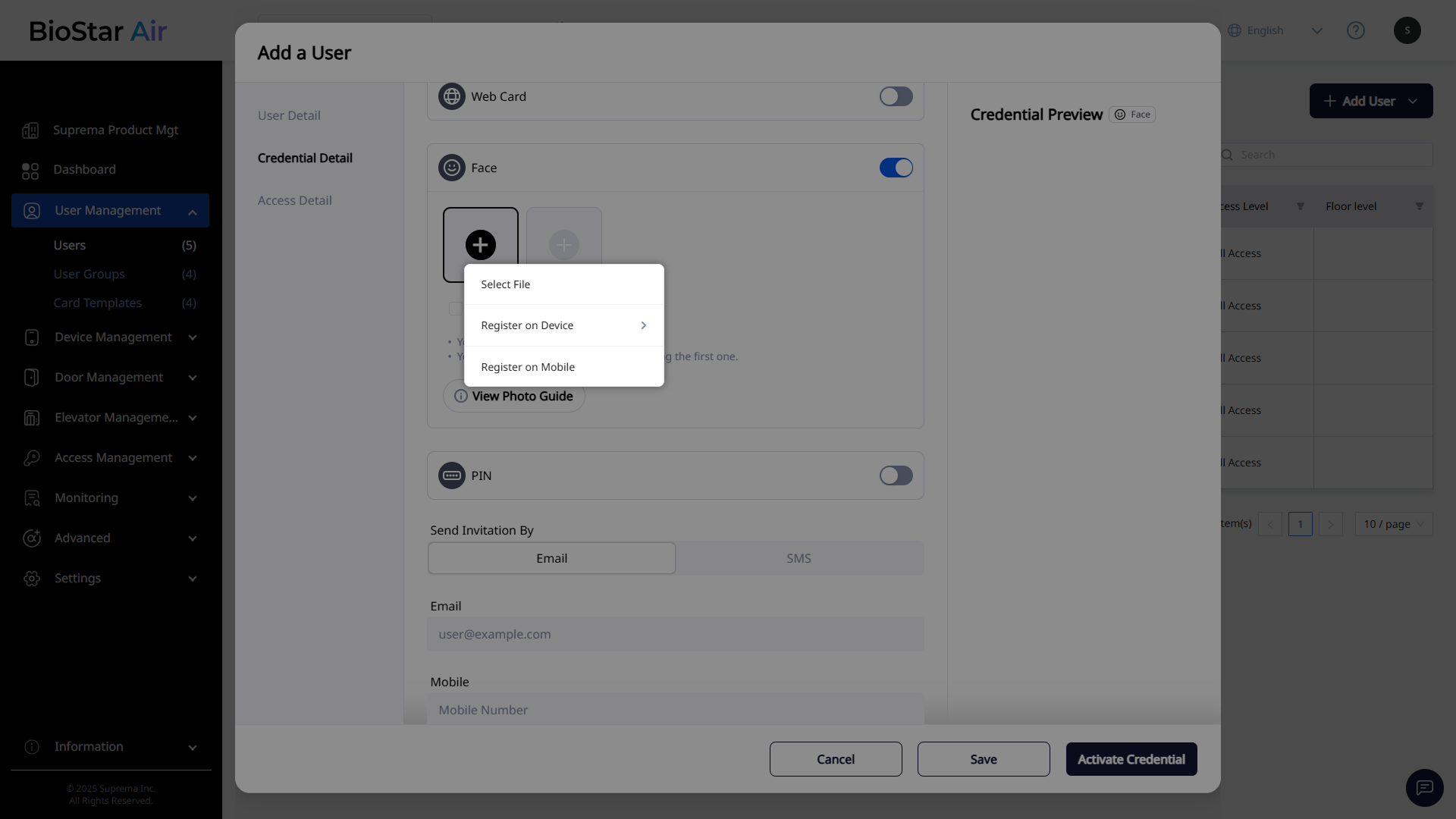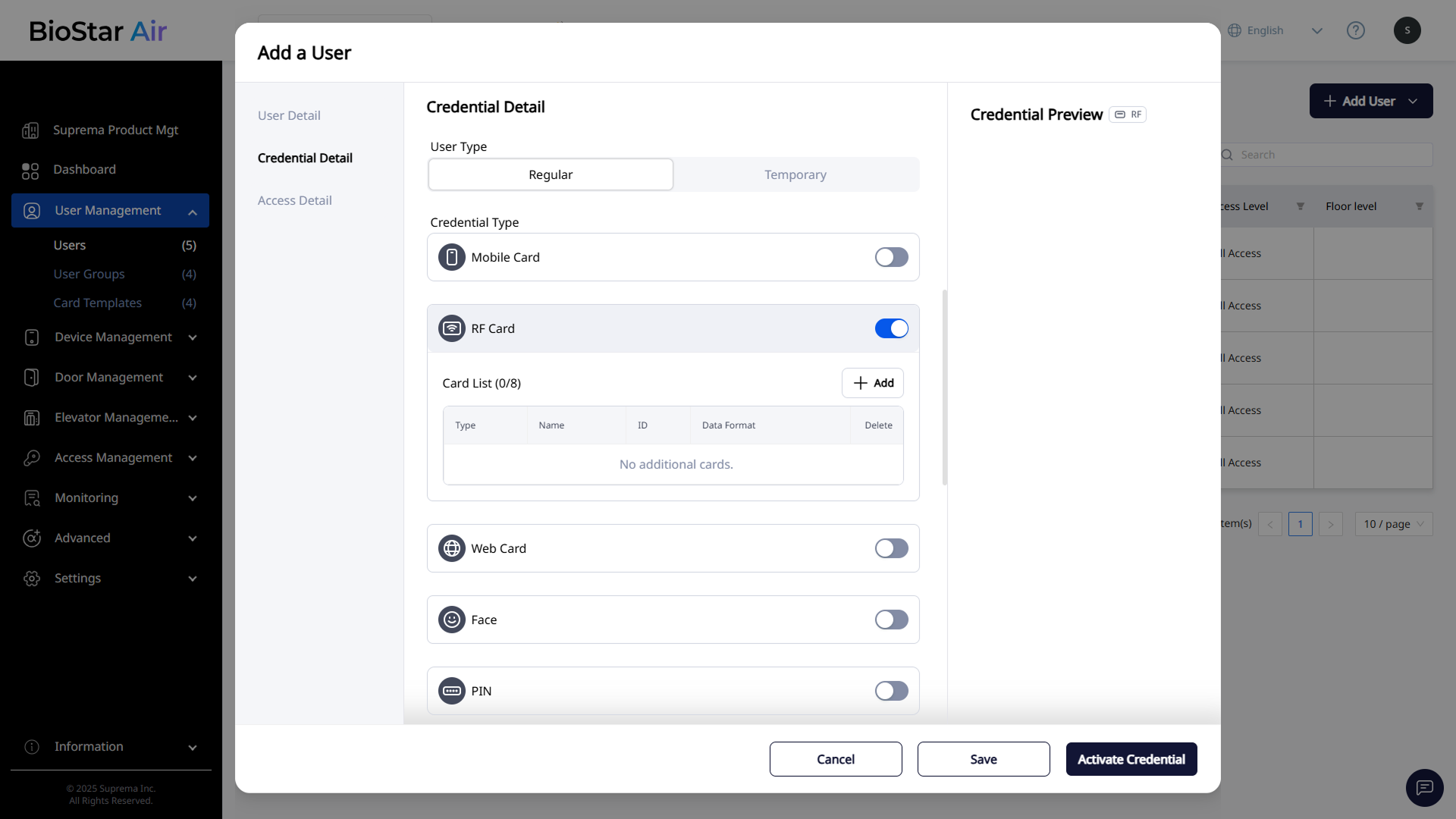 When the Add New User(s) window appears, enter and configure the required information in each section. Set the required fields in all sections and click Activate Credential at the bottom right.