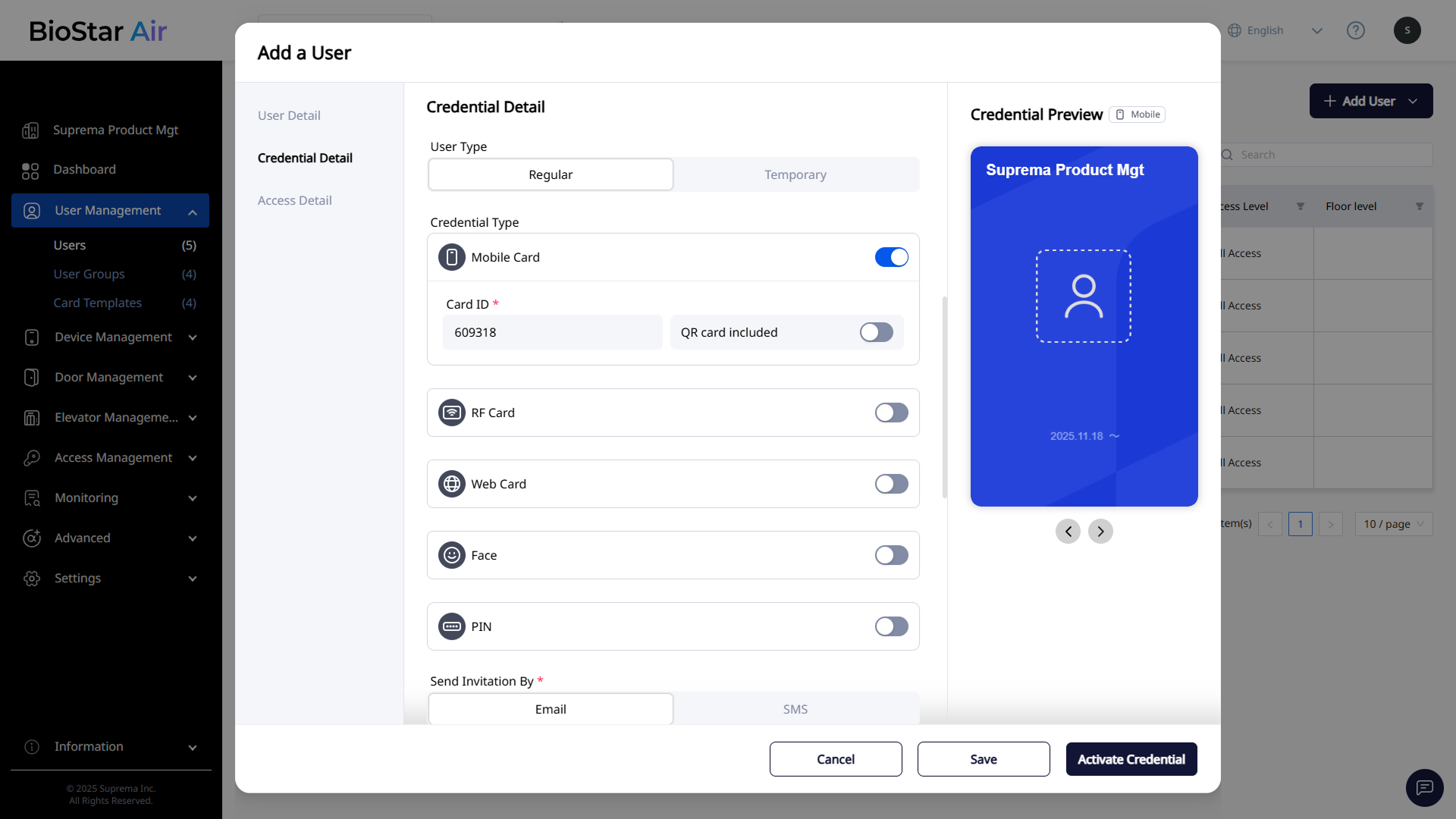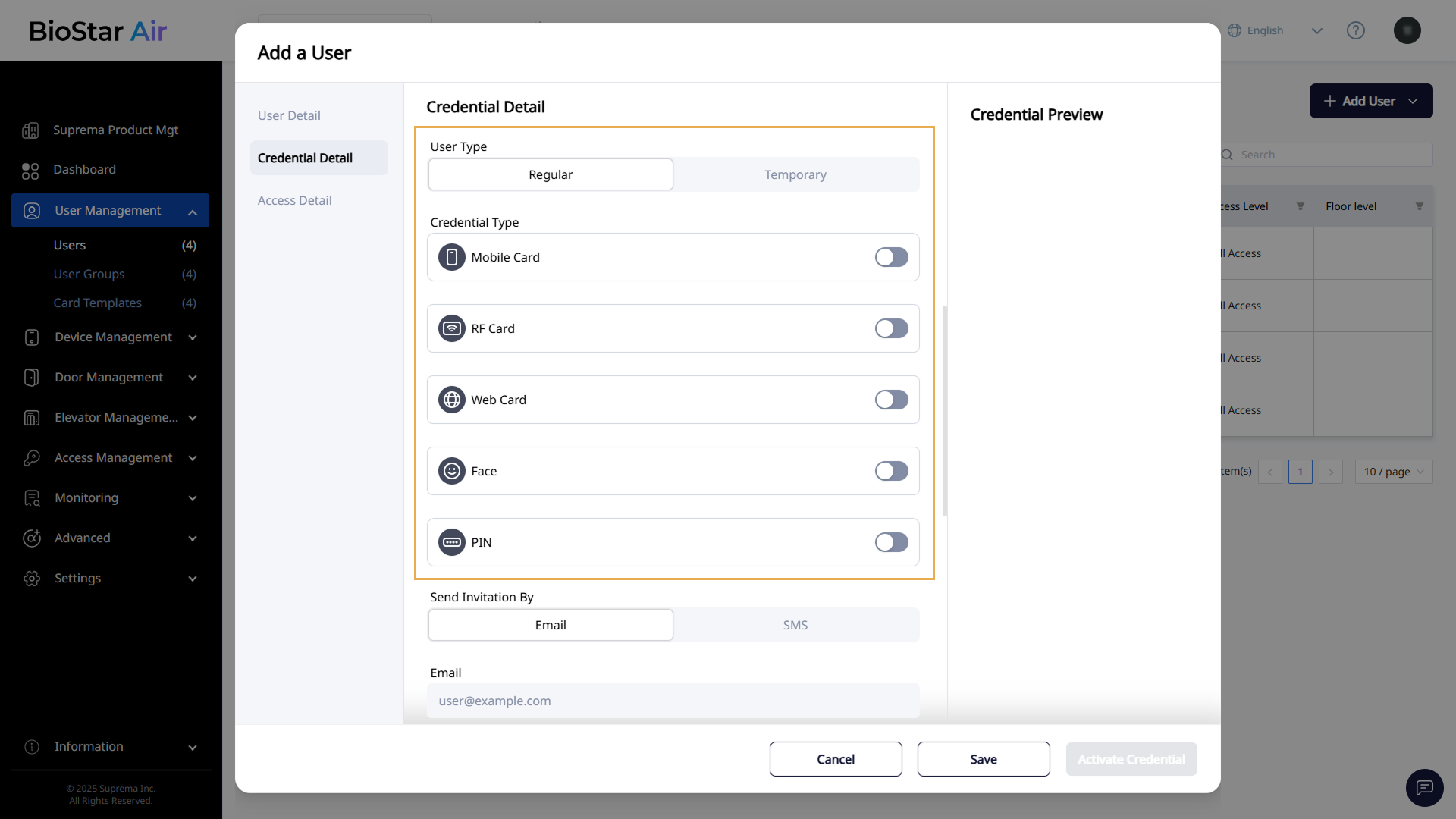 Enter the user's email and phone number in Send Invitation By in the Credential Detail section.